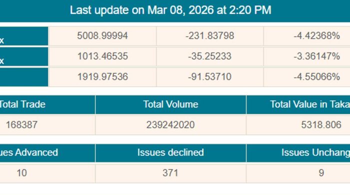 মধ্যপ্রাচ্যে যুদ্ধের কারণে জ্বালানি তেলের সংকট সৃষ্টি হতে পারে, এমন গুঞ্জনের পরিপ্রেক্ষিতে শেয়ারবাজারের বিনিয়োগকারীরা আতঙ্কগ্রস্ত হয়ে পড়েছেন। আতঙ্কে মাত্রাতিরিক্ত বিক্রির চাপ বাড়ানোয় সপ্তাহের প্রথম কার্যদিবস রোববার (৮ মার্চ) রীতিমতো ধস